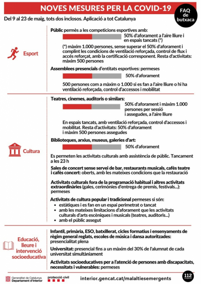 Adjuntem la resolució amb totes les mesures vigents i us recomanem visitar la pàgina de Preguntes Freqüents habilitada per la Generalitat