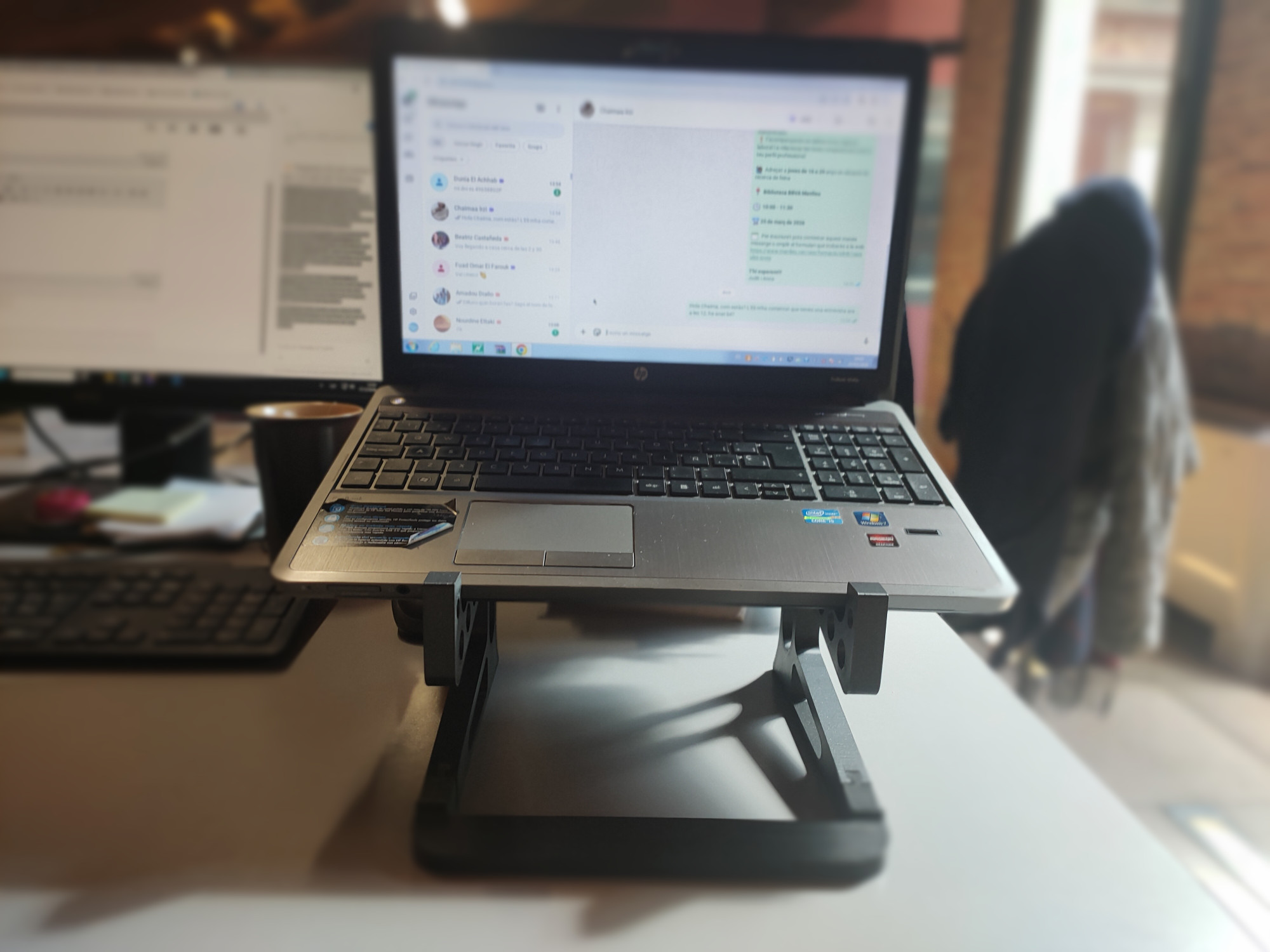 Entre totes les propostes, va destacar especialment la creació d’un suport per a ordinadors portàtils que permetés elevar la pantalla a una alçada més ergonòmica i, alhora, aprofitar l’espai inferior per guardar el teclat addicional que també utilitzaven.
