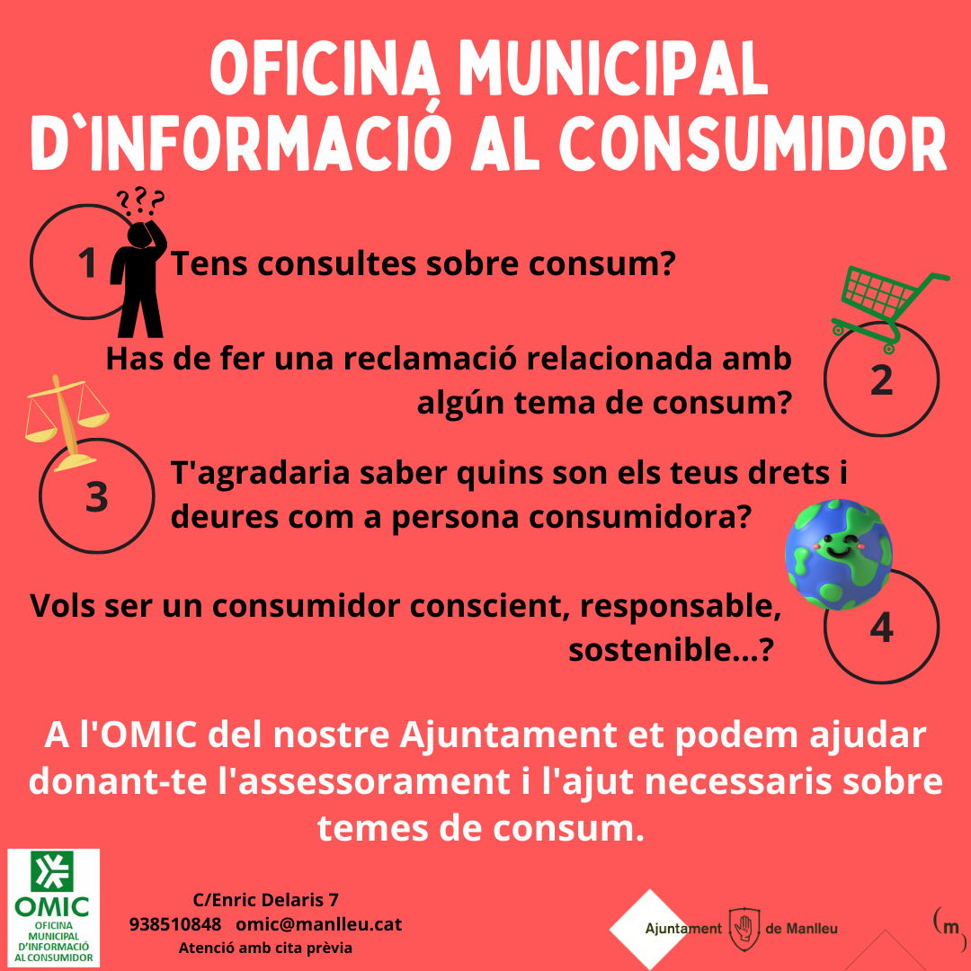 A l'OMIC de l'Ajuntament et podem ajudar donant-te l'assessorament i l'ajut necessaris sobre temes de consum. Horari d'atenció: Dimarts des de les 11 h a les 14 h al Carrer Enric Delaris, 7. Cal demanar cita prèvia al 938510848, o bé per e-mail a omic@manlleu.cat