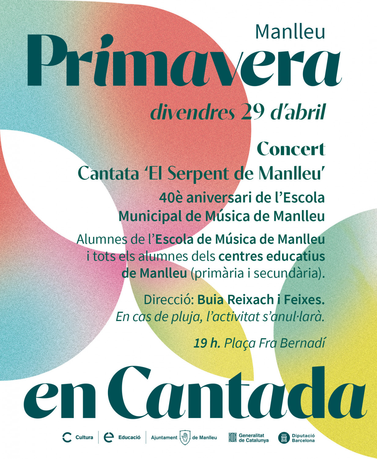 El divendres, 29 d’abril, l'Escola Municipal de Música de Manlleu organitza una cantata amb uns 500 nois i noies dels centres d'educació de primària i secundària de Manlleu.
