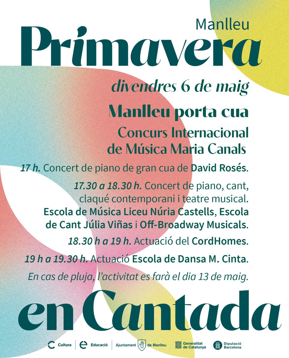 Finalment, el divendres 6 de maig, el Concurs Internacional de Música Maria Canals torna a posar 3 pianos a les mans dels manlleuencs i manlleunques. Hi haurà tres pianos ubicats a la plaça Fra Bernadí, la plaça de Dalt Vila i els rentants del passeig del Ter.