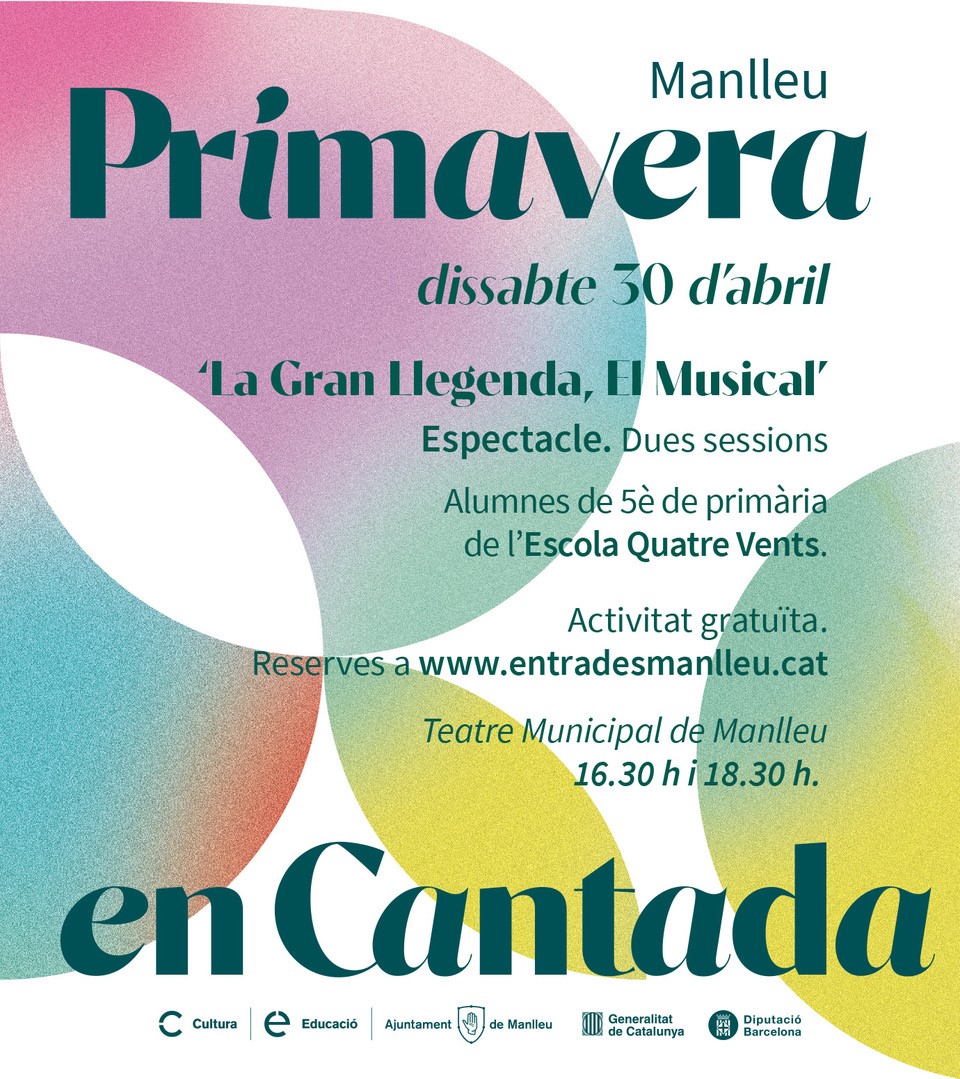 El dissabte, 30 d’abril, serà el torn dels nens i nenes de l’escola Quatre Vents, que oferiran un musical per a tots els públics basat en la llegenda tradicional de St. Jordi. ‘La Gran Llegenda, El Musical’ es podrà veure al Teatre municipal de Manlleu el dissabte a les 16.30 h i a les 18.30 h.