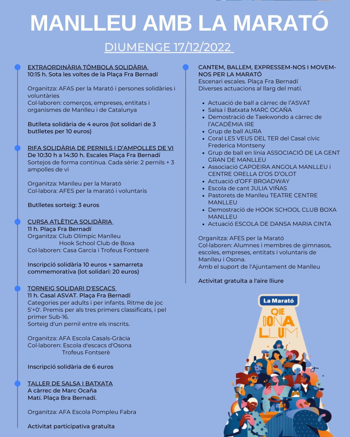 Adjuntem a l'apartat d'imatges els actes que es celebraran a Manlleu amb motiu de La Marató de TV3 d'enguany.