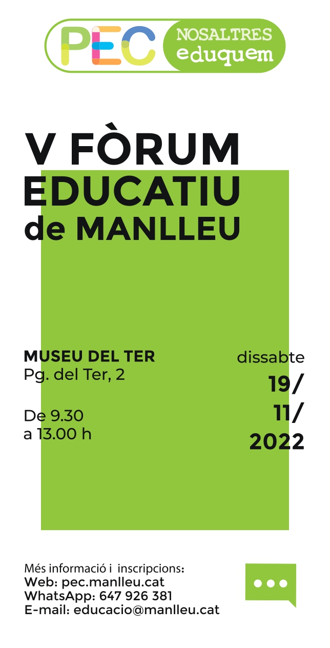 El dissabte 19 de novembre, el Museu del Ter acollirà la cinquena edició del Fòrum Educatiu de Manlleu, el gran espai de participació del Projecte Educatiu de Ciutat (PEC) del municipi. Després de dos anys sense poder-se celebrar a causa de la pandèmia, el PEC Manlleu torna a organitzar aquesta jornada oberta a tota la ciutadania, que servirà per reflexionar sobre les necessitats educatives del municipi i valorar i prioritzar quins seran els reptes i projectes que es volen treballar en els propers quatre o cinc anys.