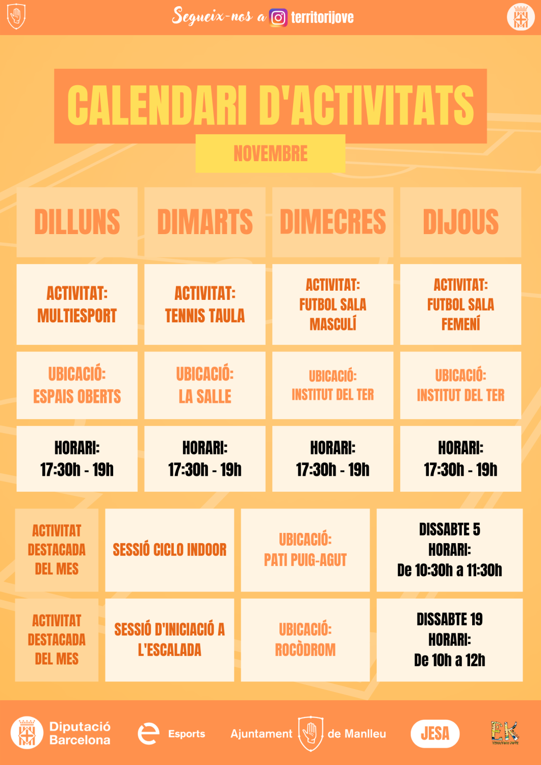 L’oferta setmanal es canviarà cada mes, podent així practicar i conèixer diferents esports. Es programaran també activitats puntuals en cap de setmana.