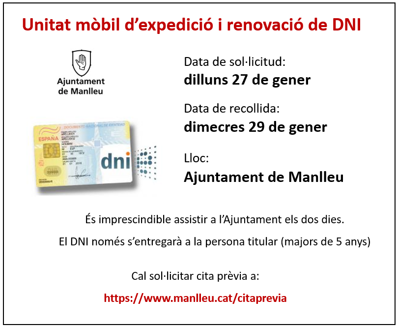 El dilluns 27 de gener caldrà sol·licitar-lo i el dimecres 29 de gener recollir-lo.