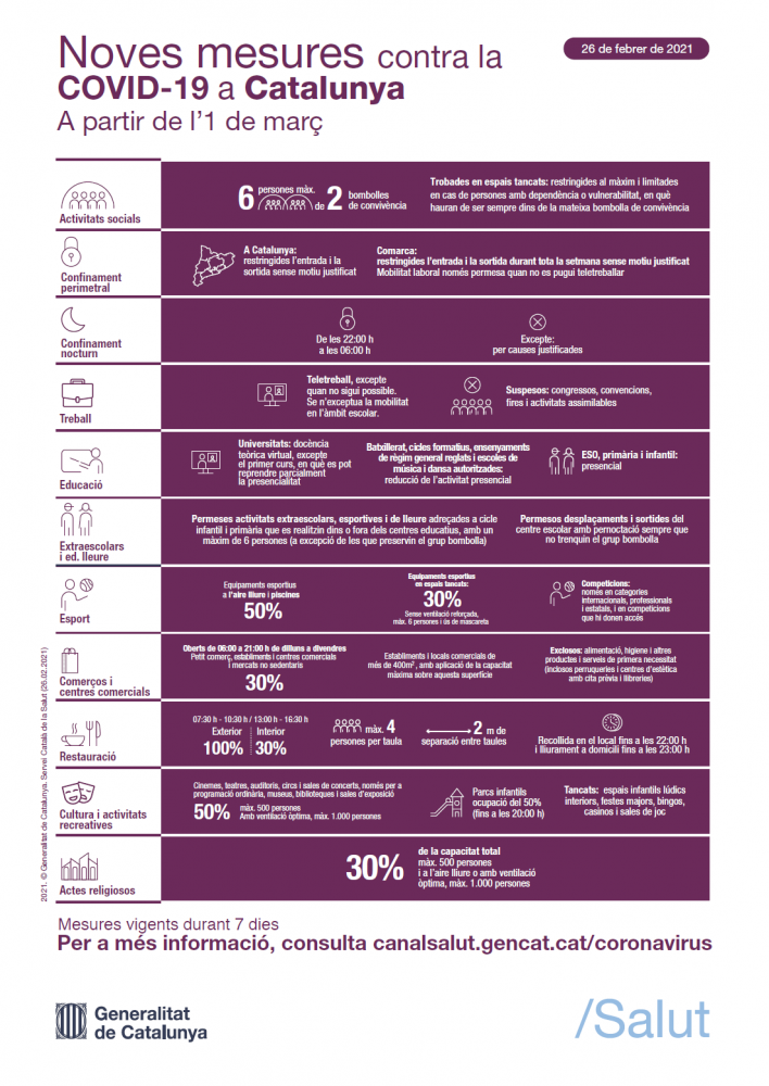 Adjuntem la infografia amb la informació referent als canvis aplicats en les mesures per a la contenció de la COVID-19 a tot Catalunya.