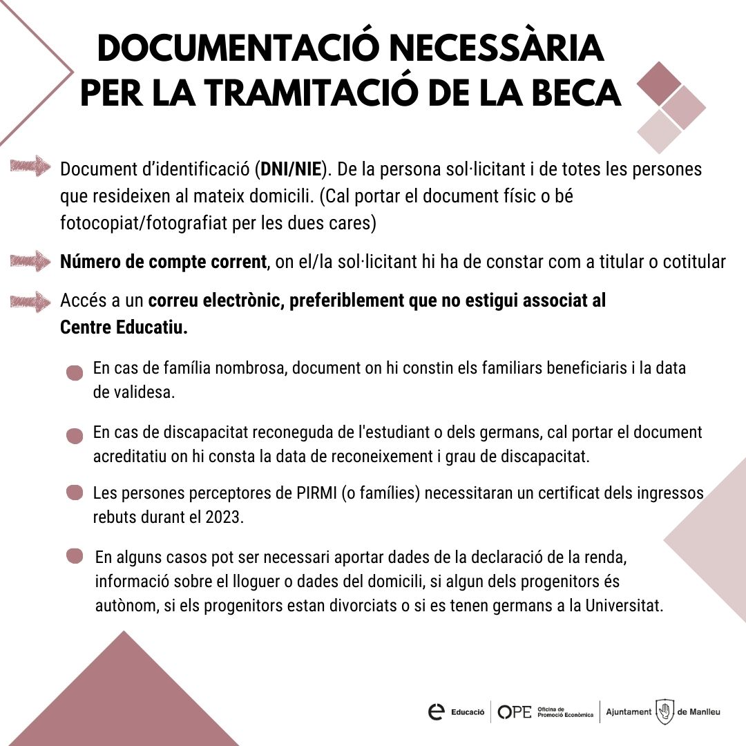 Del 19 de març al 10 de maig de 2024 està obert el període de sol·licitud de beques per a alumnes d’estudis post obligatoris (curs 2024-2025), convocades pel Ministeri d’Educació, Cultura i Esport. Per rebre l'acompanyament al tràmit i per participar a la sessió informativa cal contactar amb l'OPE Manlleu: