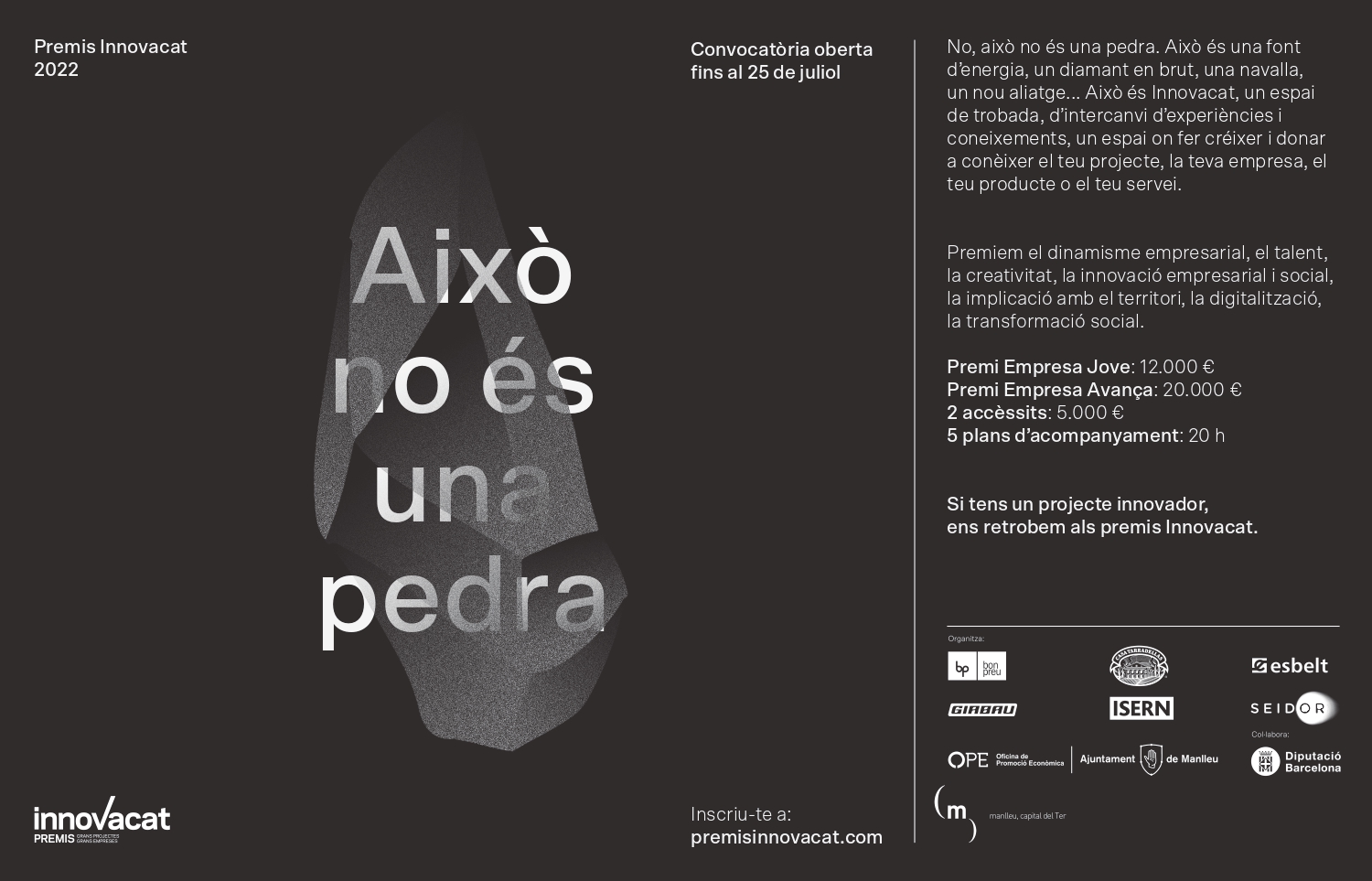 L’Ajuntament de Manlleu i les empreses BonPreu, Casa Tarradellas, Esbelt, Girbau, Isern i Seidor convoquen la 8a edició dels Premis Innovacat, després de l’ajornament de l’última edició a causa de la pandèmia, amb l’objectiu de potenciar i dinamitzar el teixit econòmic i productiu del nostre territori. La nova edició d’aquests premis empresarials biennals volen ser, de nou, un instrument financer i de promoció de nous projectes al territori. Trobareu tota la informació al web