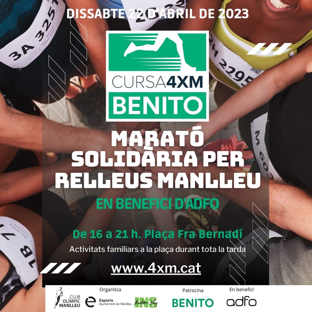 Aquest dissabte, 22 d'abril, es celebrarà a Manlleu la 4xMBenito, una cursa solidària per relleus que destina la seva recaptació a ADFO (Associació de diversitat funcional d’Osona). A la plaça Fra Bernadí, inici i final de la cursa, hi haurà diferents activitats per gaudir de la tarda en família.