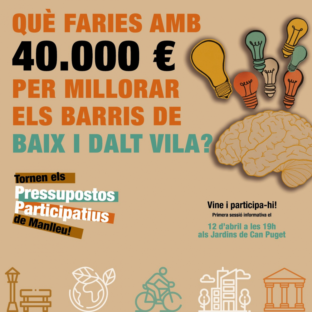 D’aquesta manera, l’ajuntament anima a tot manlleuenc i manlleuenca a participar del procés en les seves diferents fases i a implicar-se al màxim per millorar i transformar la ciutat. Tota la informació del procés es podrà anar seguint, de manera permanent i com avançàvem anteriorment, a https://participa.manlleu.cat/  a les xarxes socials, i a partir de tota la sèrie d’elements de difusió offline que es trobaran en comerços i carrers de la ciutat.
