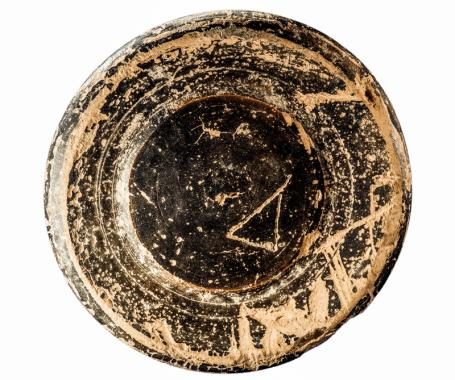 MIT: 10004. Fons de píxide de ceràmica de vernís negre amb signe ibèric inscrit (semblant a un triangle) en posterioritat a la cocció (100-25 aC). Hi havia el costum que el propietari o propietària marqués les peces. Can Caseta.