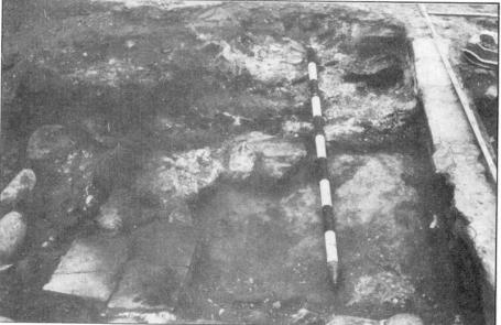 Restes del mur de distribució interna de l’edifici identificat com la Casa del Comú, localitzat durant les excavacions a la plaça del Pou (1985). Foto: Walter Cruells