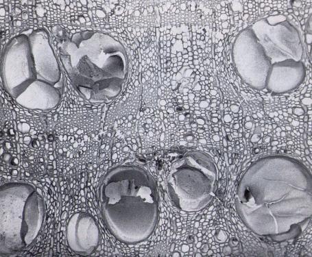 Secció transversal d’un carbó de roure (Quercus sp.) augmentat vuitanta vegades