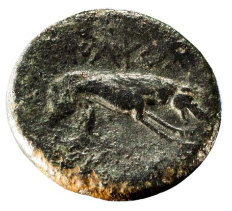 Revers: llop a la dreta amb el cap avall, a sobre llegenda ibèrica ILTIRTA.