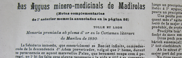 Cases i Reig, J. (1888). “Las Aguas minero-medicinales de Madirolas”. A: El Faro de Puig- Agut, p. 88. Manlleu. Inèdit. [Sèrie dipositada a la Biblioteca Municipal de Manlleu]