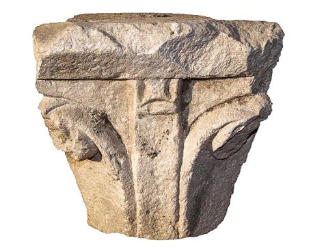 Capitell romànic que possiblement formava part d’alguna columna de l’antiga església de Santa Maria. Forma part del conjunt d’elements arquitectònics recollits durant el desenrunament de l’església després de ser dinamitada l’any 1936. Identificat amb la lletra E en els dibuixos publicats per F. Pujol. MEV13726