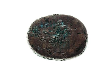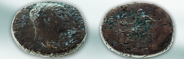 Revers: Concòrdia (deessa dels acords) asseguda a l’esquerra amb doble cornucòpia (corn, símbol de l’abundància), al davant altar (98-102dC).
