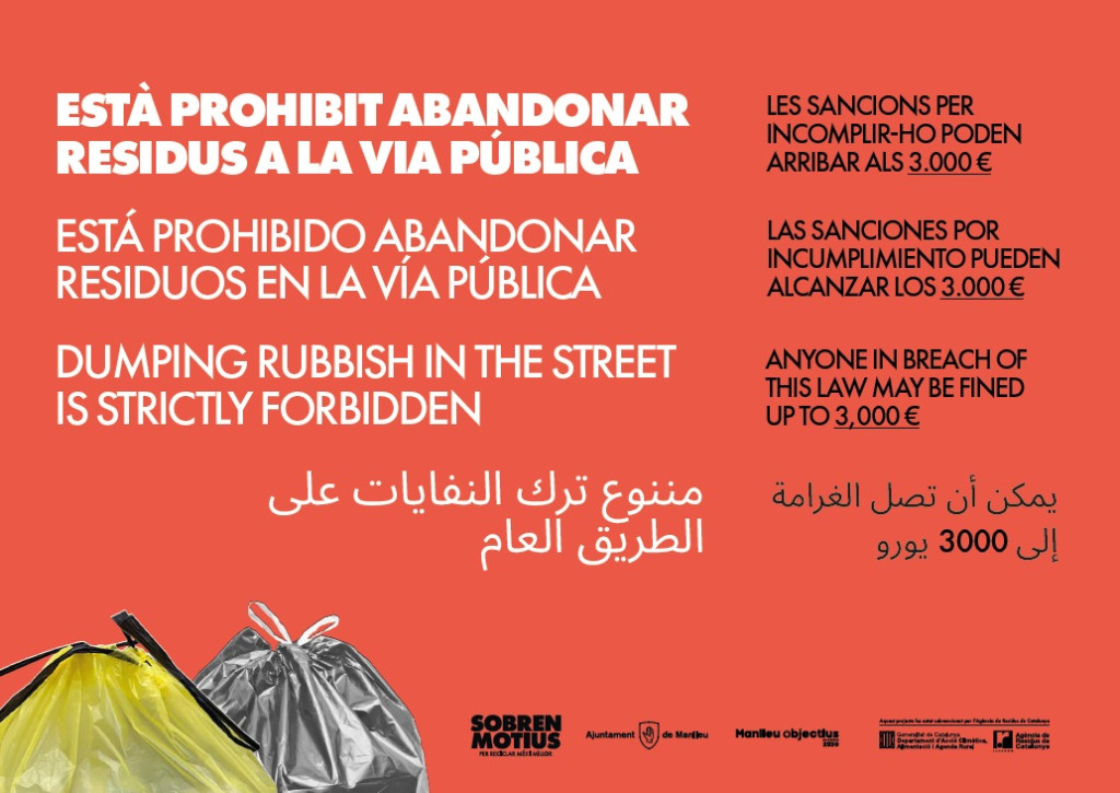 - Col·locació de vinils als contenidors de vidre on actualment s’hi troben bosses de deixalles abandonades al terra. En aquests cartells s’informa de la prohibició d’abandonar residus a la via pública i que l’abandonament pot ser objecte de multes de fins a 3.000€.