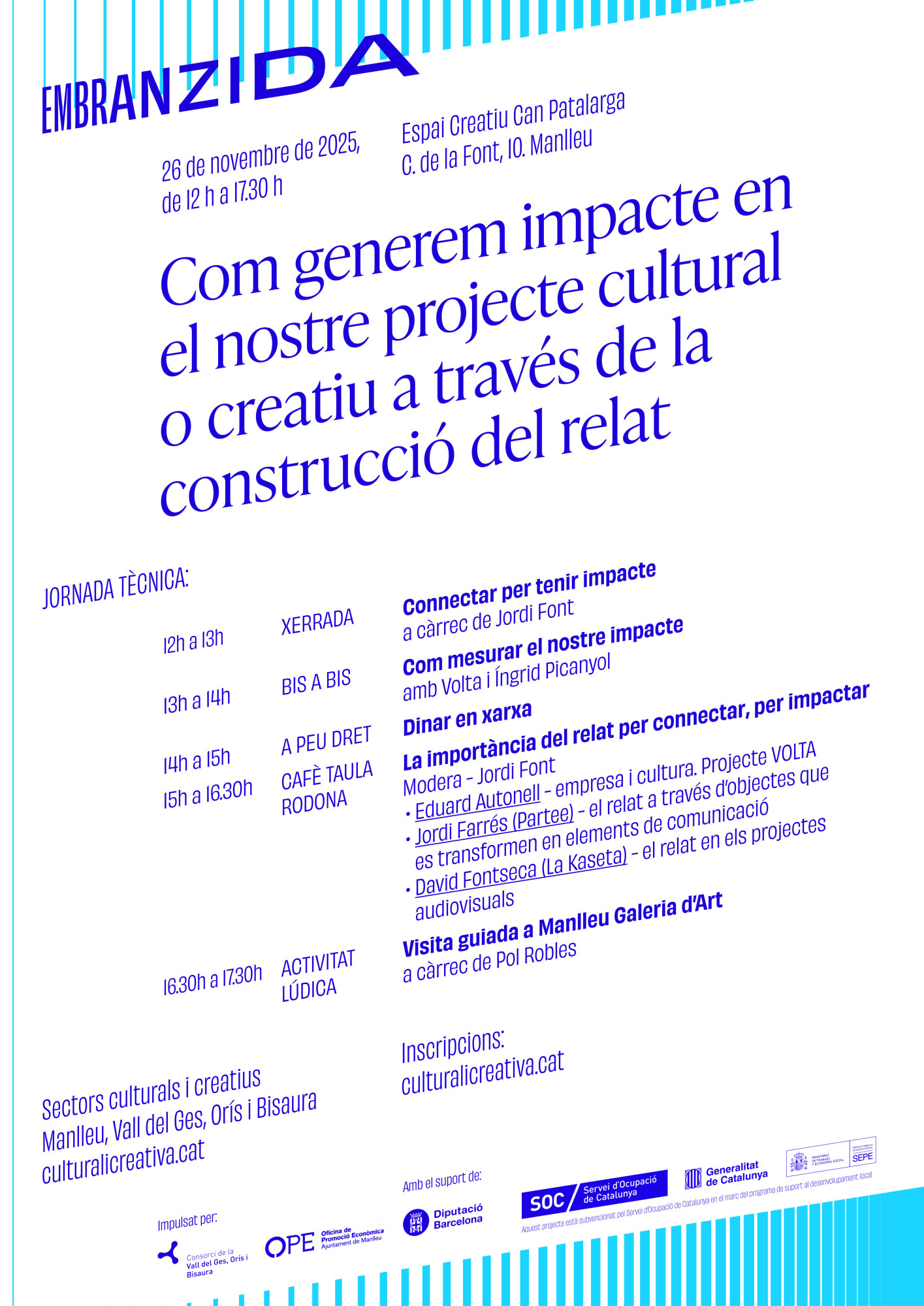 L'OPE Manlleu i el Consorci de la Vall del Ges, Orís i Bisaura, dins del projecte Embranzida Creativa, han organitzat la jornada tècnica Impacte i relat.