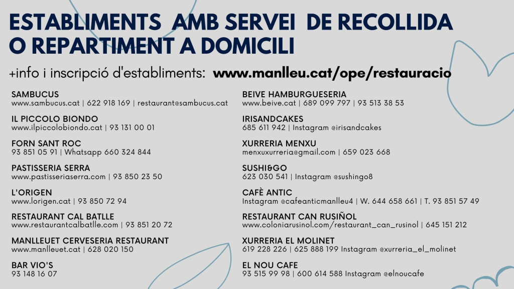 A causa de les mesures que s'han pres per frenar els contagis de la COVID-19 al nostre país, les empreses del sector de la restauració han hagut de limitar l'horari d'obertura dels seus establiments. Com a resposta, moltes d'elles ofereixen servei a domicili o bé recollida al local. A continuació us mostrem un llistat d'empreses de Manlleu que ofereixen aquest servei. Al peu, a l'apartat d'imatges hi trobareu una imatge de resum per compartir. Podeu omplir les dades del vostre local al formulari i l'afegirem.