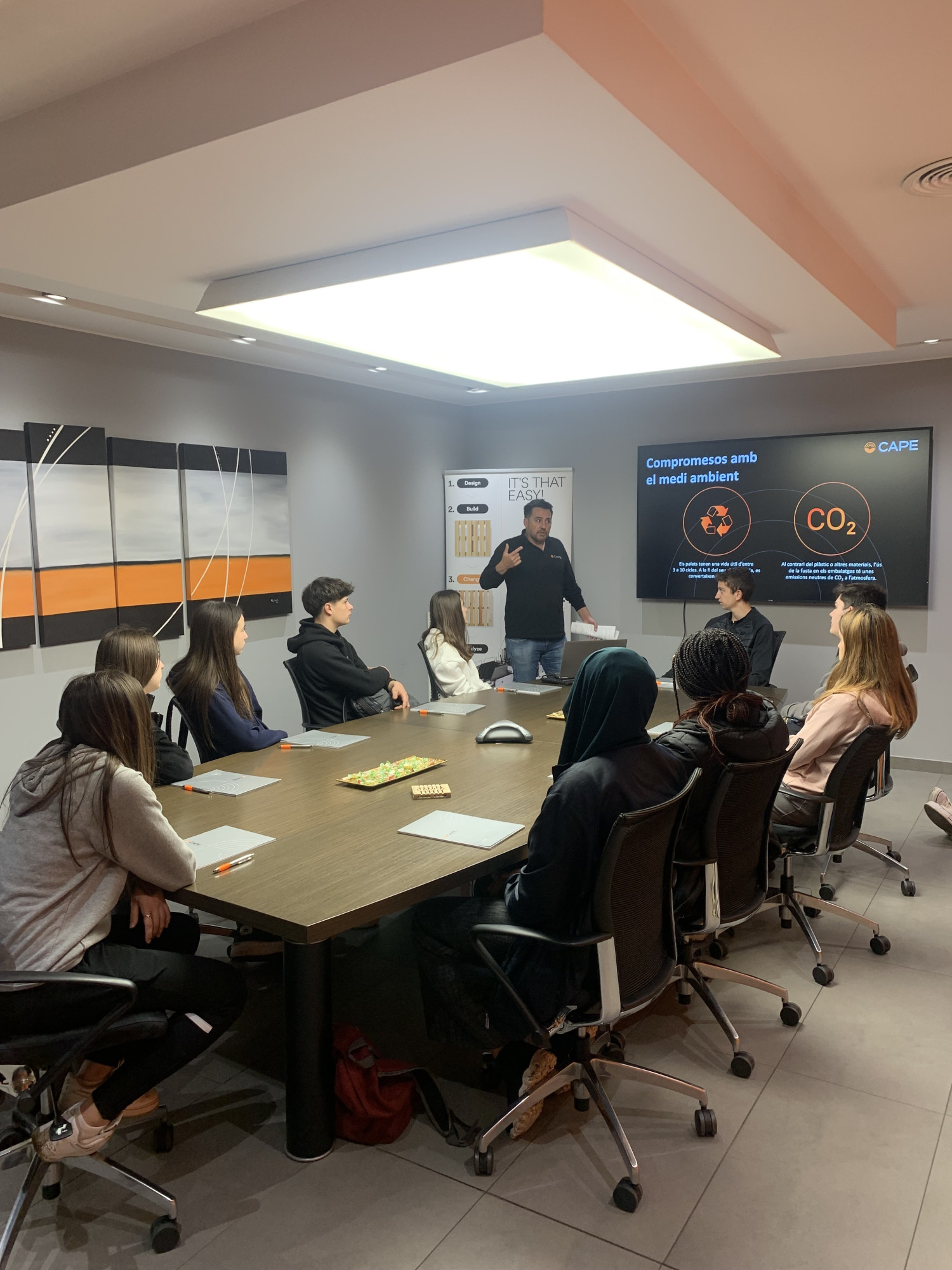La visita a Mecànica Cape va començar amb una benvinguda per part del gerent, Marc Pérez, qui va explicar els començaments de l'empresa i el recorregut que ha fet fins ara amb la projecció de dos vídeos i resolent preguntes de l'alumnat. A continuació es va fer un recorregut per l'empresa, passant per l'oficina tècnica i per la zona de la nau on hi ha la maquinària que fabriquen. L'alumnat va quedar sorprès per la mida de les màquines que construeixen i que acaben venent a empreses de tot el món.