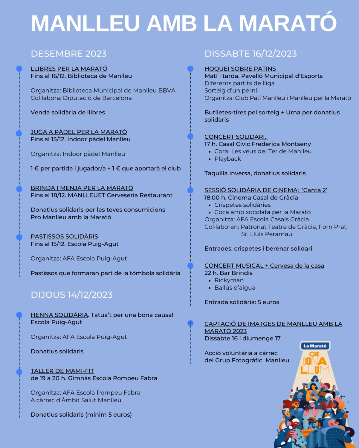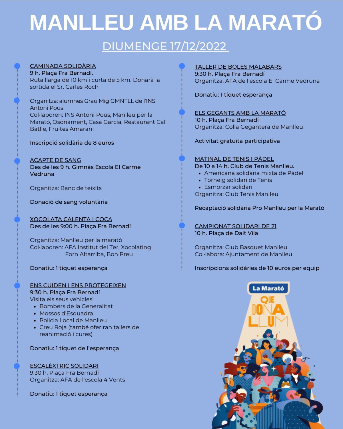 Adjuntem a l'apartat d'imatges els actes que es celebraran a Manlleu amb motiu de La Marató de TV3 d'enguany.