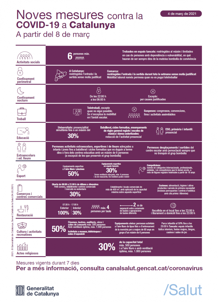 Adjuntem la infografia amb la informació referent als canvis aplicats en les mesures per a la contenció de la COVID-19 a tot Catalunya.