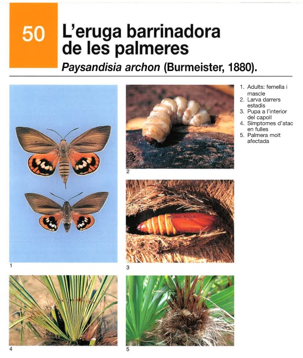 La Paysandisia Archon (eruga barrinadora de les palmeres) en el seu estat de papallona pon ous prop de la corona de les palmeres. Una vegada neixen les larves, penetren dins el tronc per tal d’alimentar-se i créixer. Les larves són xilòfagues i perforen túnels i cavitats a l’interior del tronc arribant a matar l’exemplar en la majoria dels casos. S’han detectat alguns exemplars de palmeres mortes a diferents espais de Manlleu. La propera setmana, es procedirà a retirar aquests exemplars per evitar que es converteixin en un perill per a les persones i vehicles que hi circulen a prop.
